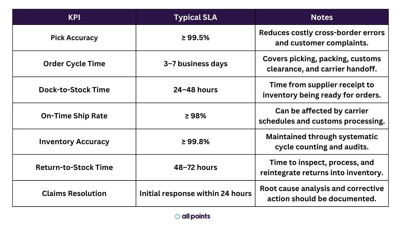 Establishing clear performance metrics is critical for managing cross-border fulfillment success. Typical Service Level Agreements (SLAs) and Key Performance Indicators (KPIs) guiding China fulfillment center operations include: