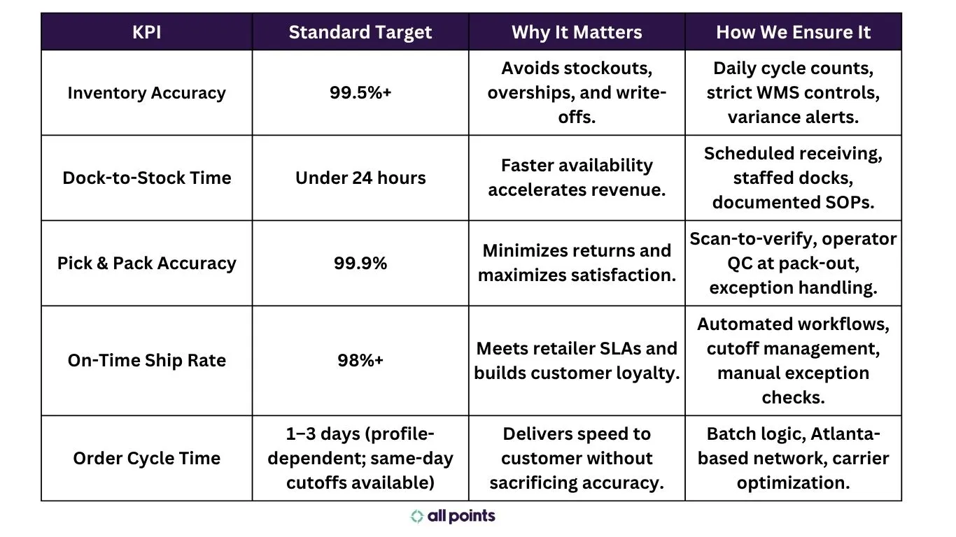 Measurable performance standards ensure your logistics partner meets your brand’s commitments consistently. Below are common KPIs and typical targets underscored by All Points’ operational excellence framework.