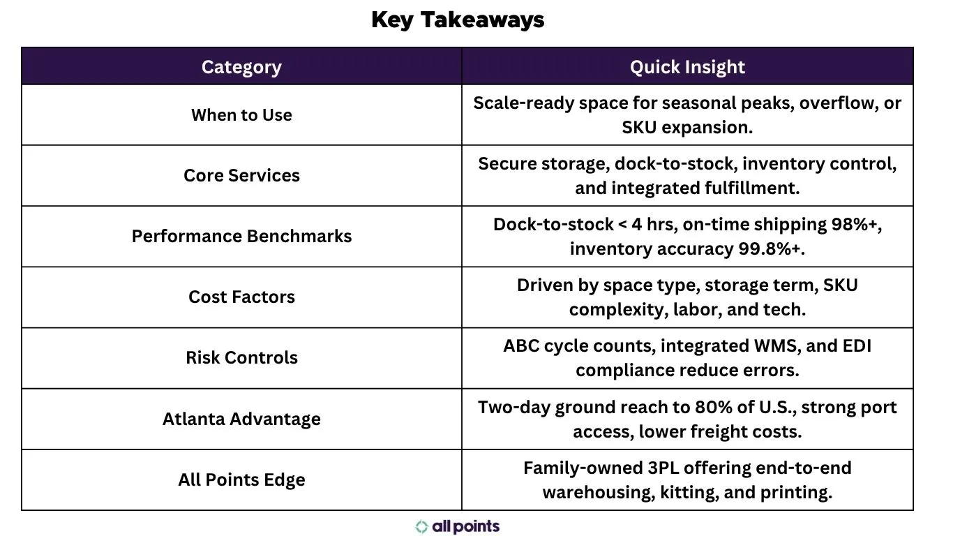 Decades of regional experience translate into operator-grade Standard Operating Procedures (SOPs), skilled labor force, and reliable carrier relationships, as highlighted in All Points’ 25+ years of Atlanta warehouse experience. - On-site printing and kitting services