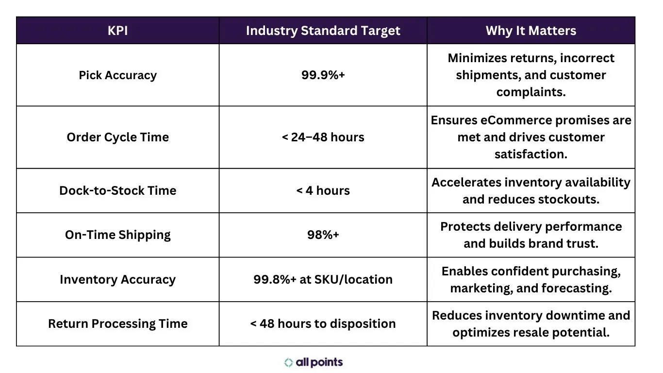- Target dock-to-stock time under 4 hours to quickly make SKUs available for picking, aligning with industry benchmarks and your SLA commitments.