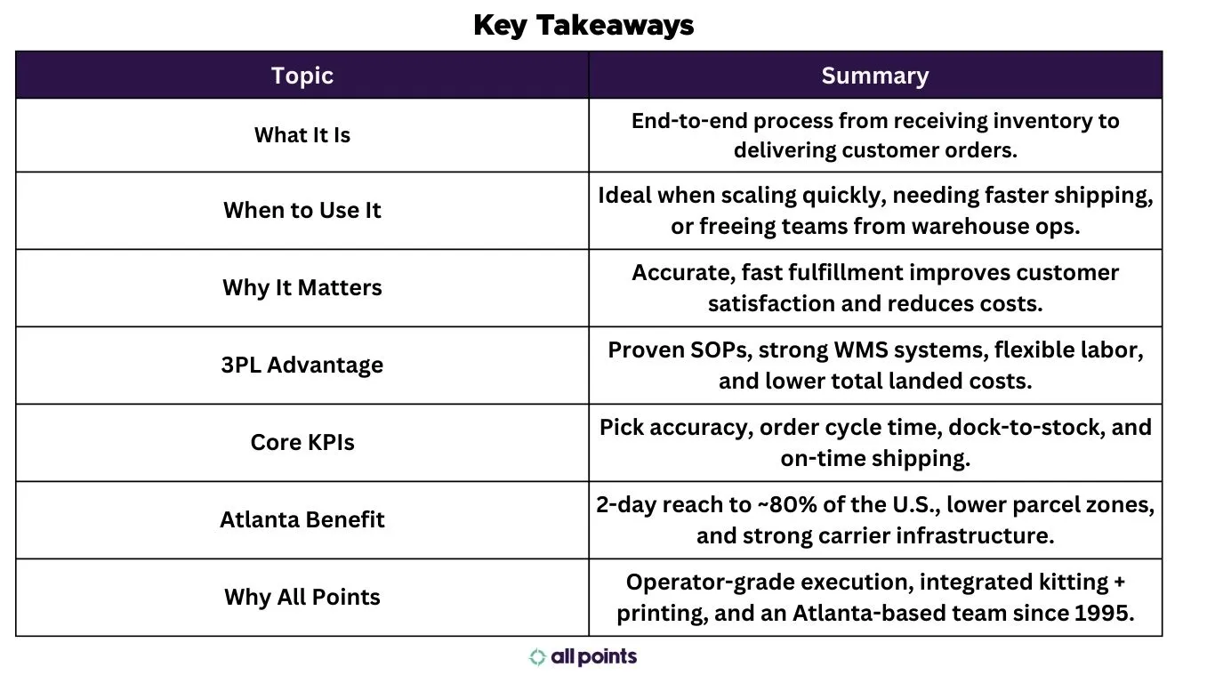 Ecommerce fulfillment covers inventory receiving, storage, picking, packing, shipping, and returns—key for seamless online retail. Outsourcing to a 3PL like Atlanta-based All Points boosts accuracy, scalability, and speed while reducing costs and risks. Learn when to outsource, key workflows, KPIs, pricing, and the Atlanta advantage.