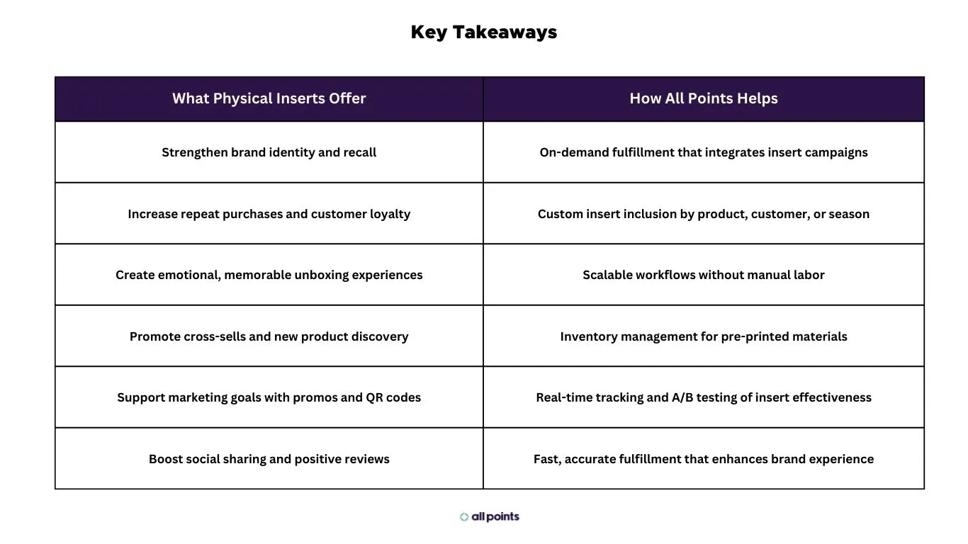 Physical inserts are more than filler. They’re your brand’s handshake. That little touchpoint tucked inside a box could be the reason they leave a glowing review. It’s a low-cost, high-reward tactic that smart brands are using to stand out in crowded markets. If you’re looking to turn your shipping boxes into brand experiences, All Points can help. Our flexible fulfillment system makes it easy to include custom inserts in any order. So you can keep surprising your customers, without adding extra work to your plate.