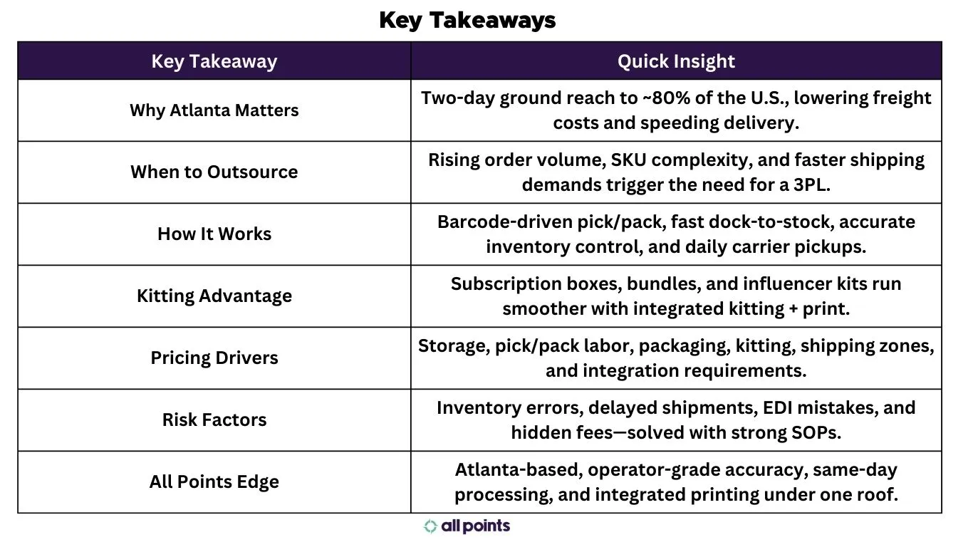 Some Atlanta 3PLs—including All Points—offer integrated printing, branded inserts, on-demand marketing collateral, and custom packaging support under one roof.
