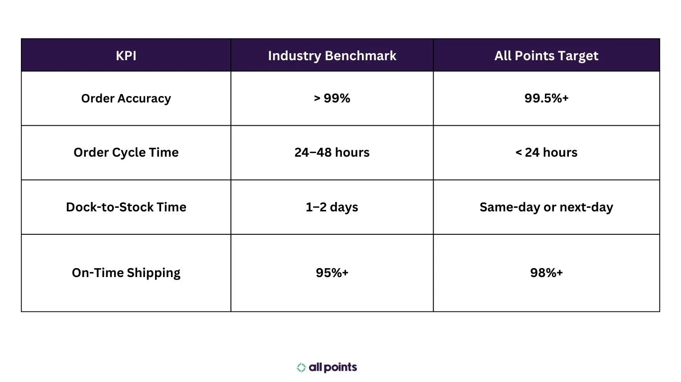 We target 99.5%+ order accuracy, same-day dock-to-stock, and 98%+ on-time shipping, backed by transparent KPIs.