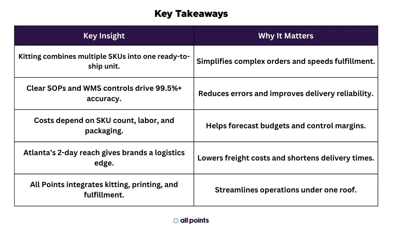 Kitting simplifies complex order assembly for DTC brands, retail marketers, and procurement leads shopping 3PLs. In today’s fulfillment industry—defined by faster delivery expectations and tighter SLAs—this guide explains what kitting is, when to use it, the workflow, pricing drivers, KPIs, risks, and why Atlanta’s location gives All Points an advantage for speed and cost.