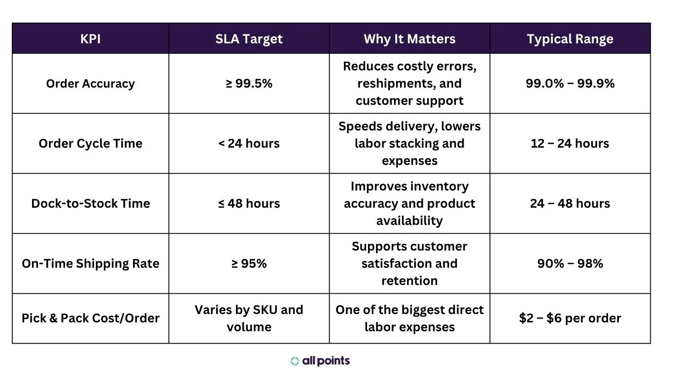 Common SLAs include dock-to-stock within 24 to 48 hours, order accuracy at or above 99.5%, on-time shipping rate of at least 95%, and same-day or next-day order processing before cutoffs.