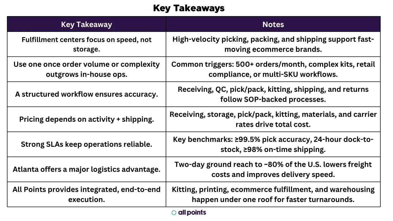 Discover how fulfillment centers boost fast, accurate order delivery and inventory control. Learn key workflows, pricing factors, vital KPIs, risks, and why Atlanta-based 3PLs like All Points offer speed, cost savings, and expert kitting for scaling DTC brands. Optimize your logistics and delight customers today!