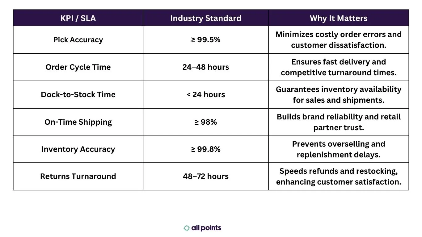 Pick accuracy ≥99.5%, on-time shipping ≥98%, dock-to-stock within 24 hours, and inventory accuracy ≥99.8%.