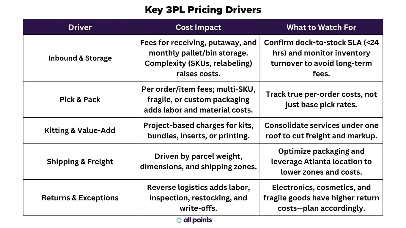 Cost impact: Parcel weight, dimensions, and shipping zones directly influence freight charges. An Atlanta-based 3PL can reduce shipping zones for most U.S. addresses, lowering freight spend.